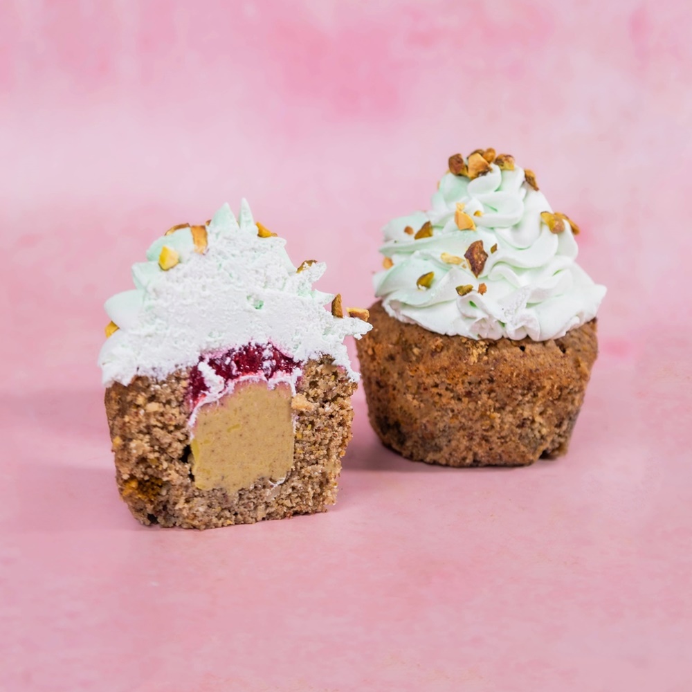 Pyszne puszyste babeczki w rozmiarze xl o smaku pistacji i wiśni w wersji wegańskiej. Przykryte puszystą chmurką z kremu śmietankowego, wersja dla smakoszy pistacji, zapakowane w box z piękną wstążka idealne na prezent.